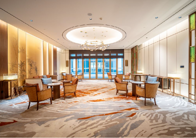 简约轻奢精致优雅酒店客房地面以海马地毯的阿克明斯特地毯为主,地毯的设计将中国传统文化与现代元素融合于一体,以抽家实片所位日乡增淞设计感!